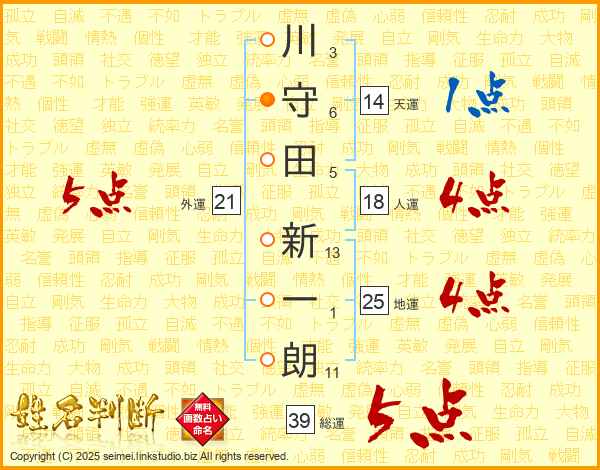 川(3画)守(6画)田(5画) 新(13画)一(1画)朗(11画)