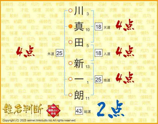 川(3画)真(10画)田(5画) 新(13画)一(1画)朗(11画)