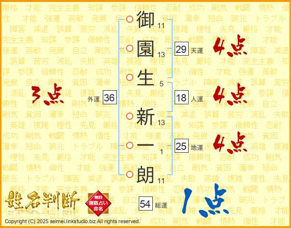 御(11画)園(13画)生(5画) 新(13画)一(1画)朗(11画)
