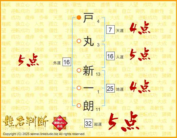 戸(4画)丸(3画) 新(13画)一(1画)朗(11画)