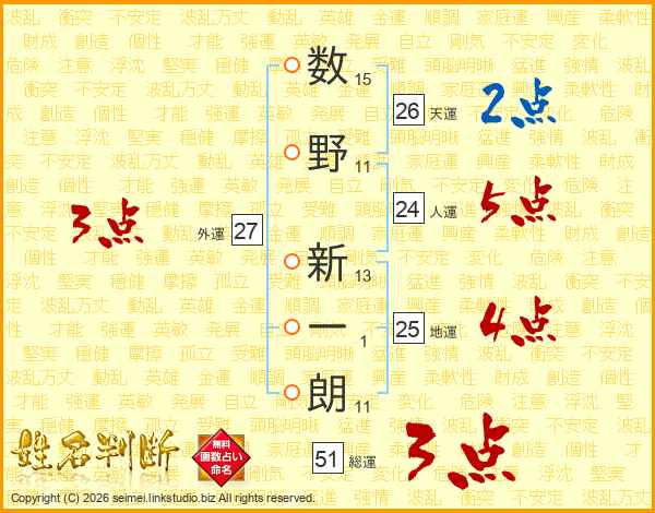 数(15画)野(11画) 新(13画)一(1画)朗(11画)