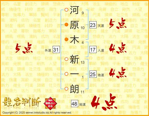 河(9画)原(10画)木(4画) 新(13画)一(1画)朗(11画)