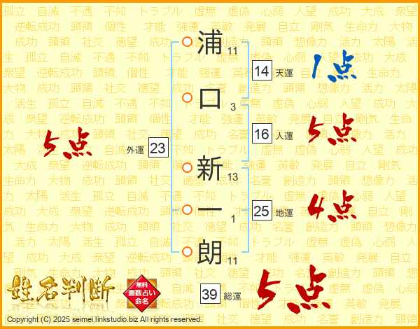 浦(11画)口(3画) 新(13画)一(1画)朗(11画)