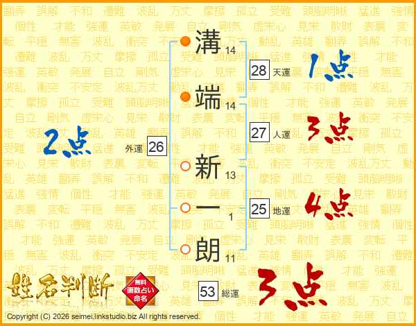 溝(14画)端(14画) 新(13画)一(1画)朗(11画)