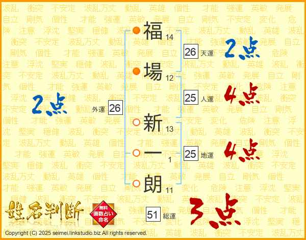 福(14画)場(12画) 新(13画)一(1画)朗(11画)