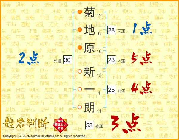 菊(12画)地(6画)原(10画) 新(13画)一(1画)朗(11画)
