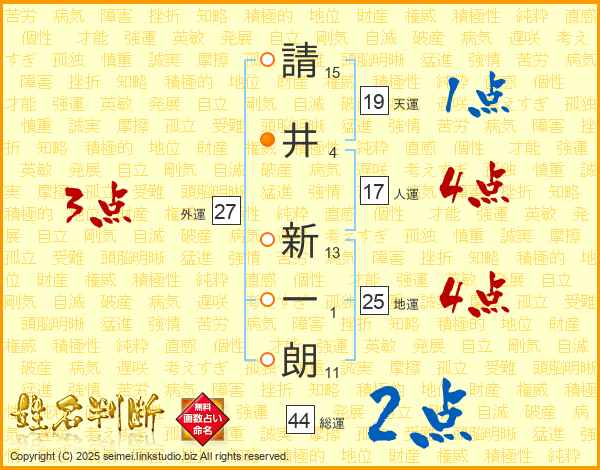 請(15画)井(4画) 新(13画)一(1画)朗(11画)