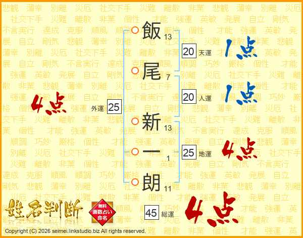 飯(13画)尾(7画) 新(13画)一(1画)朗(11画)