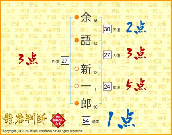 余(16画)語(14画) 新(13画)一(1画)郎(10画)