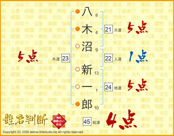 八(8画)木(4画)沼(9画) 新(13画)一(1画)郎(10画)