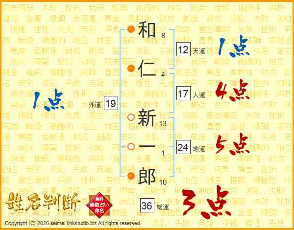 和(8画)仁(4画) 新(13画)一(1画)郎(10画)