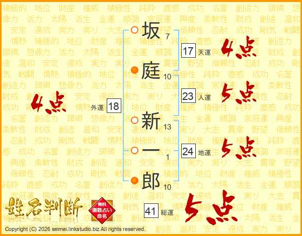 坂(7画)庭(10画) 新(13画)一(1画)郎(10画)