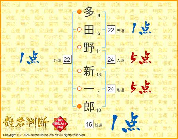 多(6画)田(5画)野(11画) 新(13画)一(1画)郎(10画)