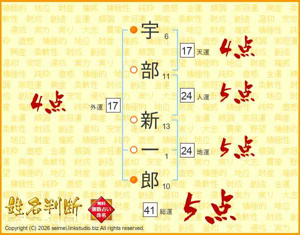 宇(6画)部(11画) 新(13画)一(1画)郎(10画)