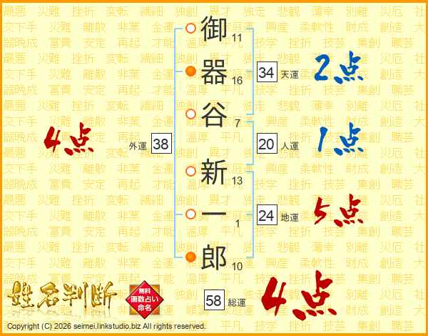 御(11画)器(16画)谷(7画) 新(13画)一(1画)郎(10画)