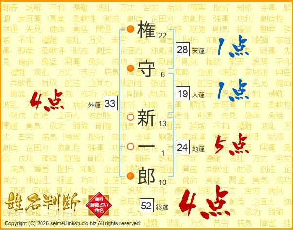 権(22画)守(6画) 新(13画)一(1画)郎(10画)