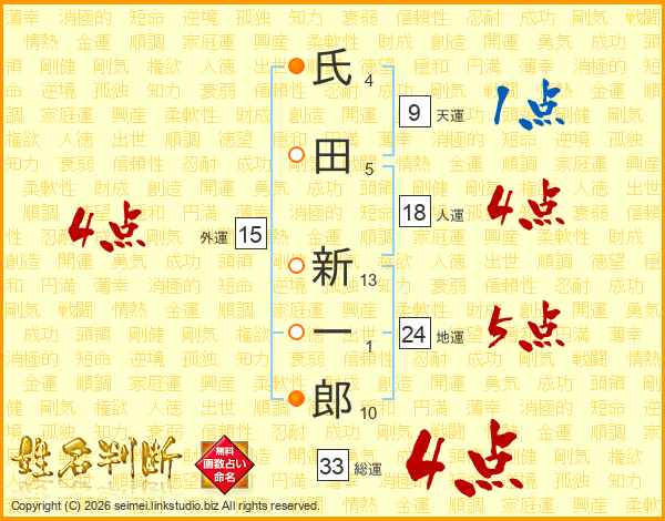 氏(4画)田(5画) 新(13画)一(1画)郎(10画)