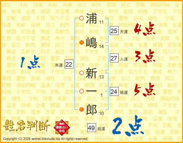 浦(11画)嶋(14画) 新(13画)一(1画)郎(10画)