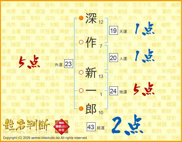 深(12画)作(7画) 新(13画)一(1画)郎(10画)