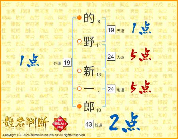 的(8画)野(11画) 新(13画)一(1画)郎(10画)