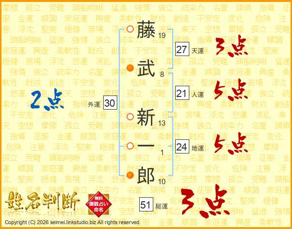 藤(19画)武(8画) 新(13画)一(1画)郎(10画)