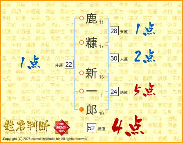 鹿(11画)糠(17画) 新(13画)一(1画)郎(10画)