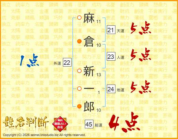 麻(11画)倉(10画) 新(13画)一(1画)郎(10画)