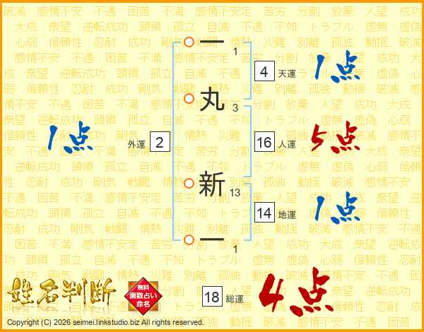 生活面を象徴する運勢です。外部から受ける影響力を表し、結婚運、家庭運や職場、環境への順応性を表します。総運から人運を引いた画数。姓や名が1文字の場合を除く。
