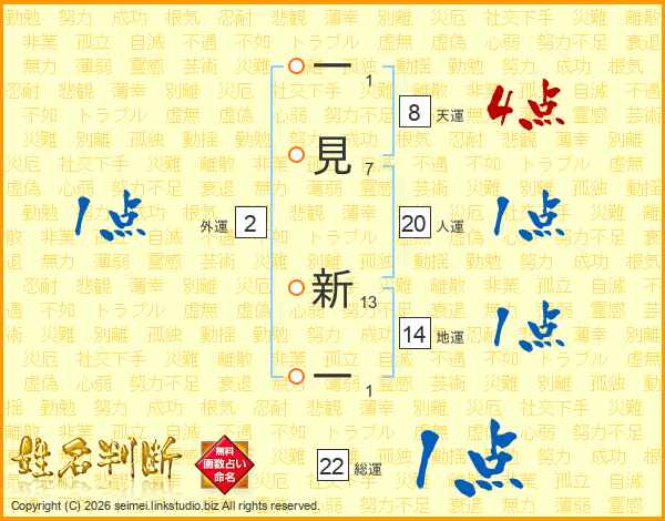 生活面を象徴する運勢です。外部から受ける影響力を表し、結婚運、家庭運や職場、環境への順応性を表します。総運から人運を引いた画数。姓や名が1文字の場合を除く。