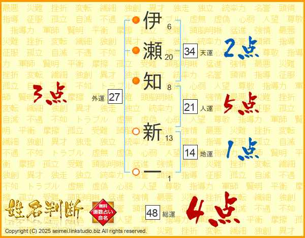 伊(6画)瀬(20画)知(8画) 新(13画)一(1画)