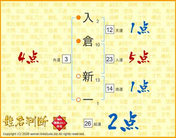 生活面を象徴する運勢です。外部から受ける影響力を表し、結婚運、家庭運や職場、環境への順応性を表します。総運から人運を引いた画数。姓や名が1文字の場合を除く。