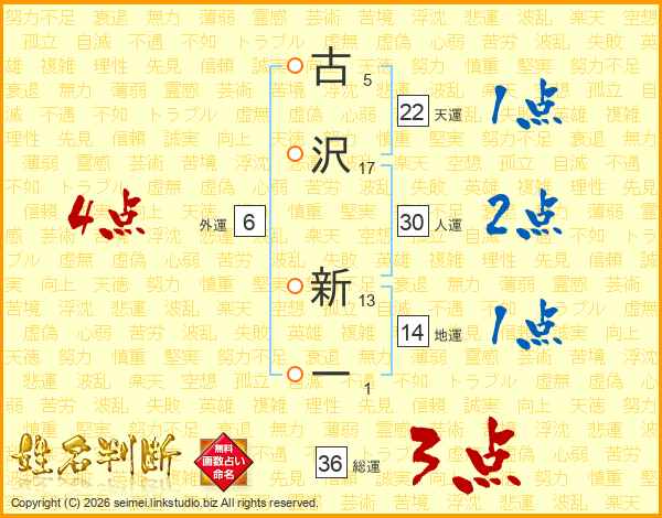 生活面を象徴する運勢です。外部から受ける影響力を表し、結婚運、家庭運や職場、環境への順応性を表します。総運から人運を引いた画数。姓や名が1文字の場合を除く。