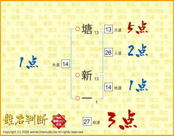 生活面を象徴する運勢です。外部から受ける影響力を表し、結婚運、家庭運や職場、環境への順応性を表します。総運から人運を引いた画数。姓や名が1文字の場合を除く。
