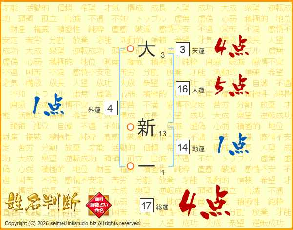 生活面を象徴する運勢です。外部から受ける影響力を表し、結婚運、家庭運や職場、環境への順応性を表します。総運から人運を引いた画数。姓や名が1文字の場合を除く。