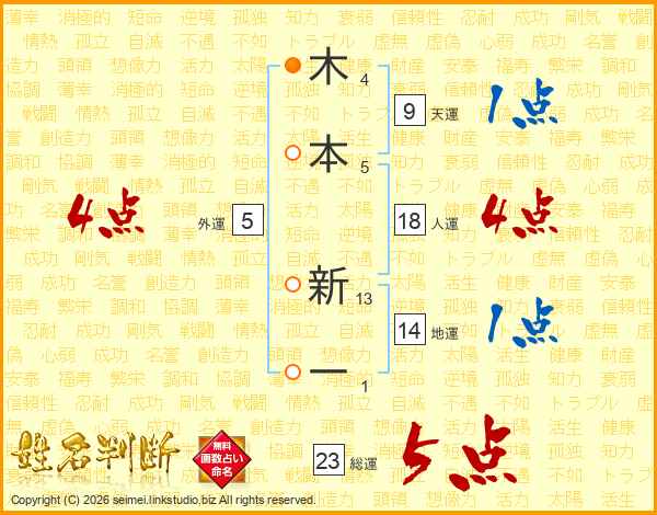 あなたの人生を表す1番重要な運勢です。生涯を通じて影響する総合運となり、主に50歳以降の晩年期に影響を及ぼします。苗字と名前の合計画数。