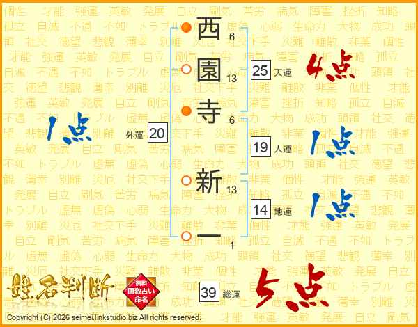 西(6画)園(13画)寺(6画) 新(13画)一(1画)