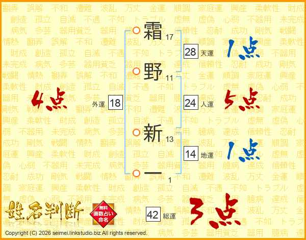 生活面を象徴する運勢です。外部から受ける影響力を表し、結婚運、家庭運や職場、環境への順応性を表します。総運から人運を引いた画数。姓や名が1文字の場合を除く。