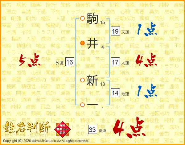 駒(15画)井(4画) 新(13画)一(1画)