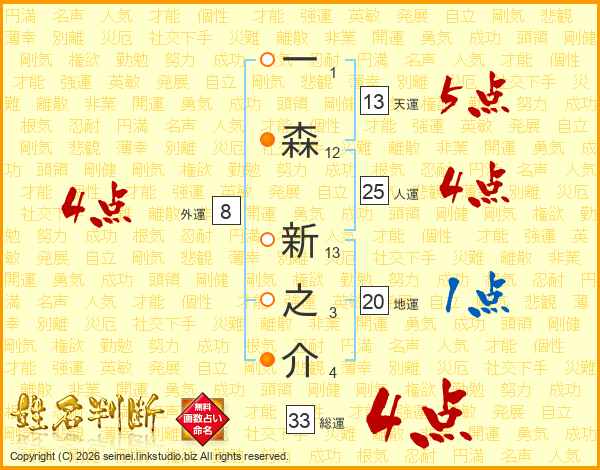 生活面を象徴する運勢です。外部から受ける影響力を表し、結婚運、家庭運や職場、環境への順応性を表します。総運から人運を引いた画数。姓や名が1文字の場合を除く。