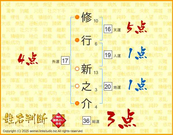 生活面を象徴する運勢です。外部から受ける影響力を表し、結婚運、家庭運や職場、環境への順応性を表します。総運から人運を引いた画数。姓や名が1文字の場合を除く。