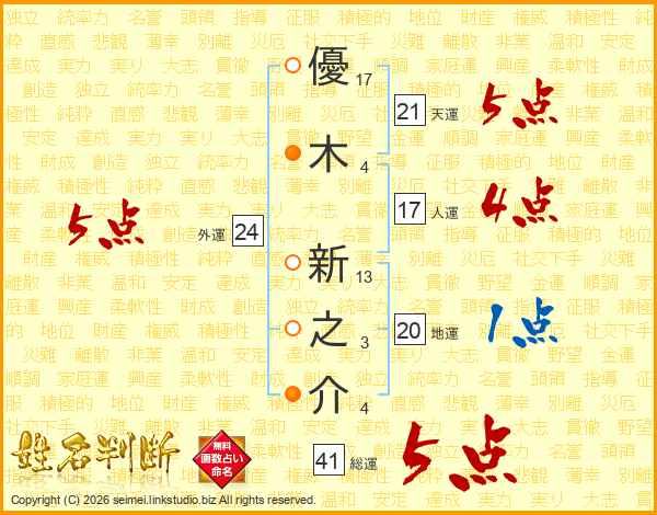 優(17画)木(4画) 新(13画)之(3画)介(4画)
