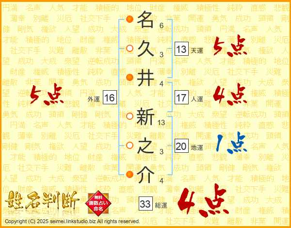 名(6画)久(3画)井(4画) 新(13画)之(3画)介(4画)