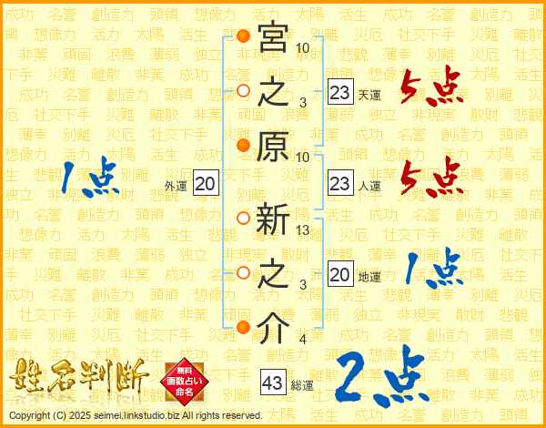 生活面を象徴する運勢です。外部から受ける影響力を表し、結婚運、家庭運や職場、環境への順応性を表します。総運から人運を引いた画数。姓や名が1文字の場合を除く。