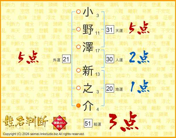 小(3画)野(11画)澤(17画) 新(13画)之(3画)介(4画)