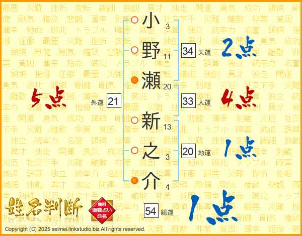 小(3画)野(11画)瀬(20画) 新(13画)之(3画)介(4画)