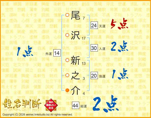 尾(7画)沢(17画) 新(13画)之(3画)介(4画)