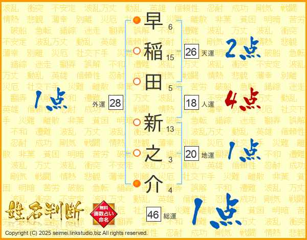 早(6画)稲(15画)田(5画) 新(13画)之(3画)介(4画)