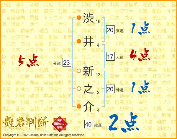 渋(16画)井(4画) 新(13画)之(3画)介(4画)