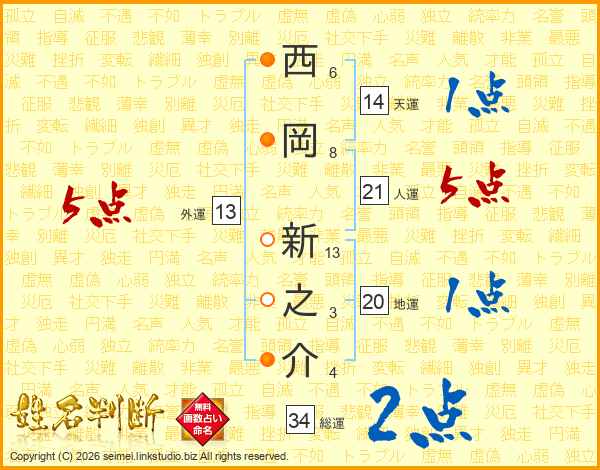 西(6画)岡(8画) 新(13画)之(3画)介(4画)