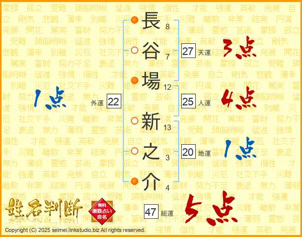 長(8画)谷(7画)場(12画) 新(13画)之(3画)介(4画)